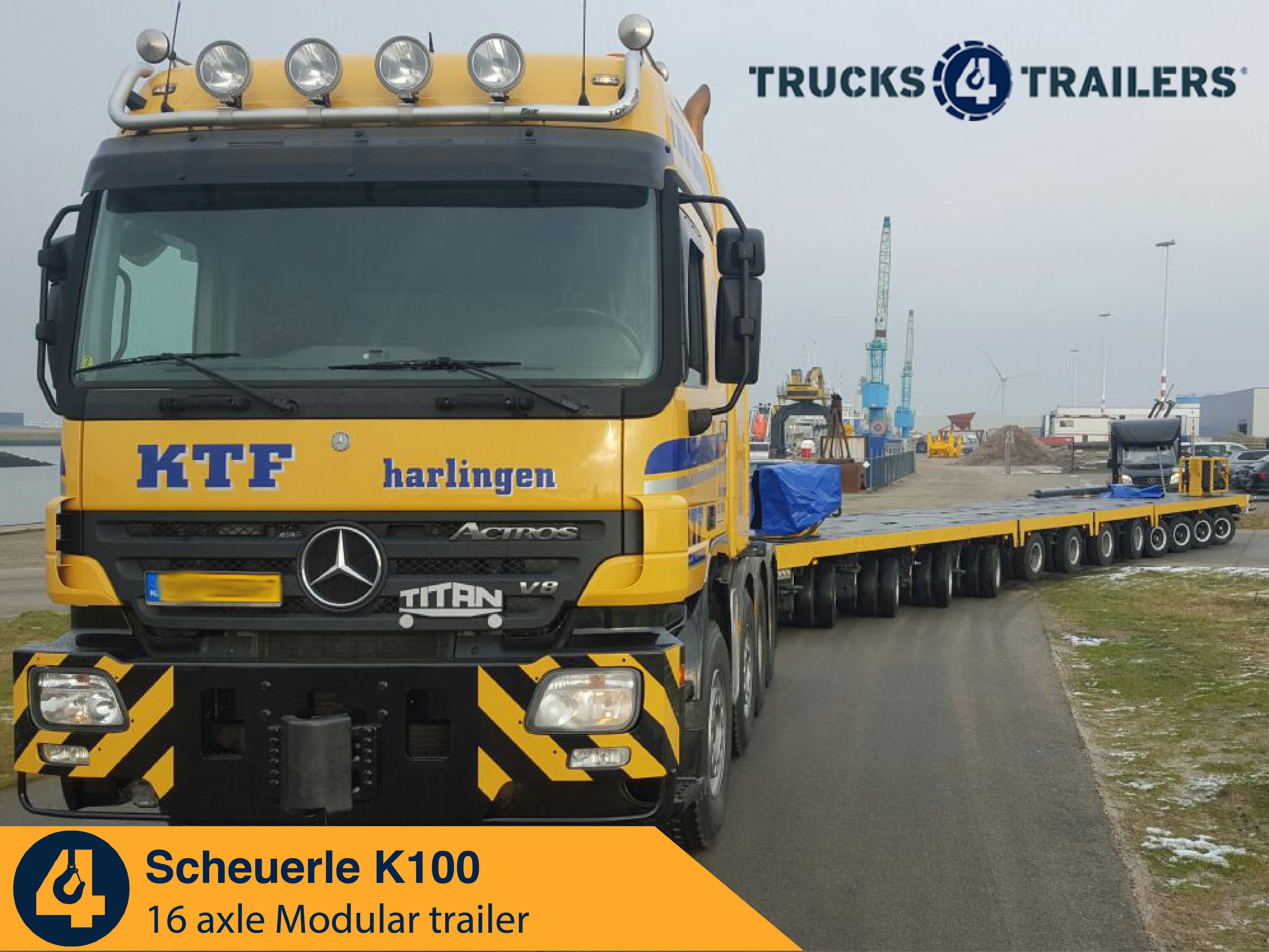 We supplied these 16 axles Scheuerle K100 modular trailer. KTF Harlingen is a dutch based heavy lift and transport company. Part of their projects is transporting wind turbines, tugboats and even transport ships of up to 52m and 150 Ton weight. The 16 axles scheuerle K100 modular trailer will be used in their future heavy transport projects.